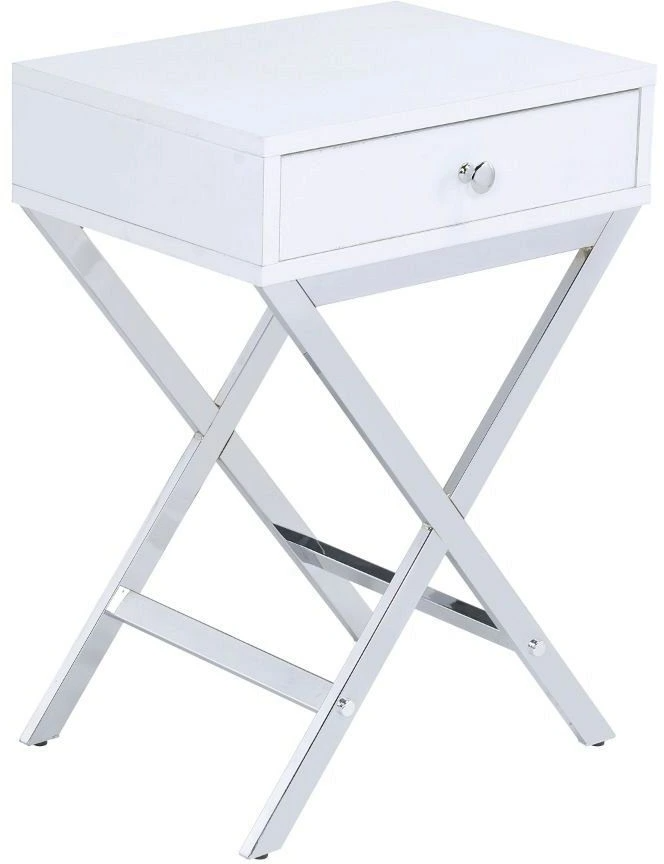 The Coleen Side Table features a modern design with a white top and a chrome base. Its standout characteristics include a sleek, rectangular design with an "X" frame base made of metal, providing both stability and style.Read More
