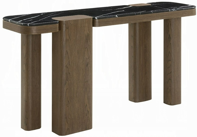 The Dana console table showcases a contemporary design with a striking faux marble top, black metal frame, and dark walnut shelf. Its clean lines and mixed materials create a sophisticated look, perfect for entryways or living spaces with modern flair.Read More