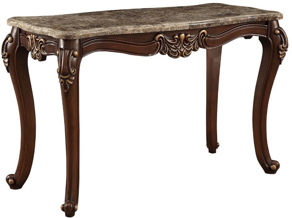 The ACME Furniture Mehadi Marble Top Sofa Table is a luxurious piece featuring a scalloped marble top imported from Turkey, complemented by a rich walnut-finished base. The table's apron is intricately carved with floral motifs and enhanced by gold-brush accents.Read More