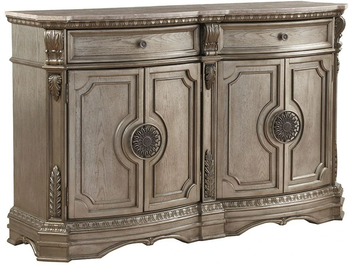 The ACME Furniture Northville Marble Top Server boasts a luxurious white marble top paired with an antique silver-finished base. Featuring ornate details, storage drawers, and cabinets, it combines functionality and elegance, making it a striking addition to any dining space.Read More