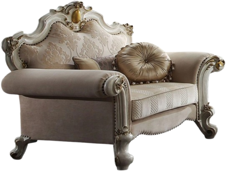 Diamond Tufted, Nailhead Trim, Oversized Crown and Raised Scrolled Trim: Antique pearl with gold brush (backrest, front armrest and base)