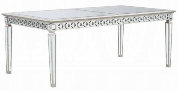 Let the Varian dining collection reflect your brilliant style! This chic set features a rectangular table accented with a beveled mirror trim in a geometric design. The matching chairs are upholstered in a lustrous blue fabric and supported by elegantly tapered legs with mirror inlay for an extra sparkle.Read More