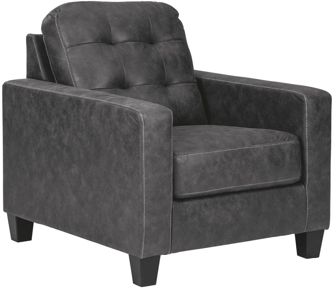This ultra-contemporary chair invites you to kick out and make yourself comfortable. Linear track arms offer a clean, sleek aesthetic, while tufted box cushions are a nod to mid-century design. Gunmetal gray faux leather offers the cool, weathered look you love and touchably soft feel you crave.