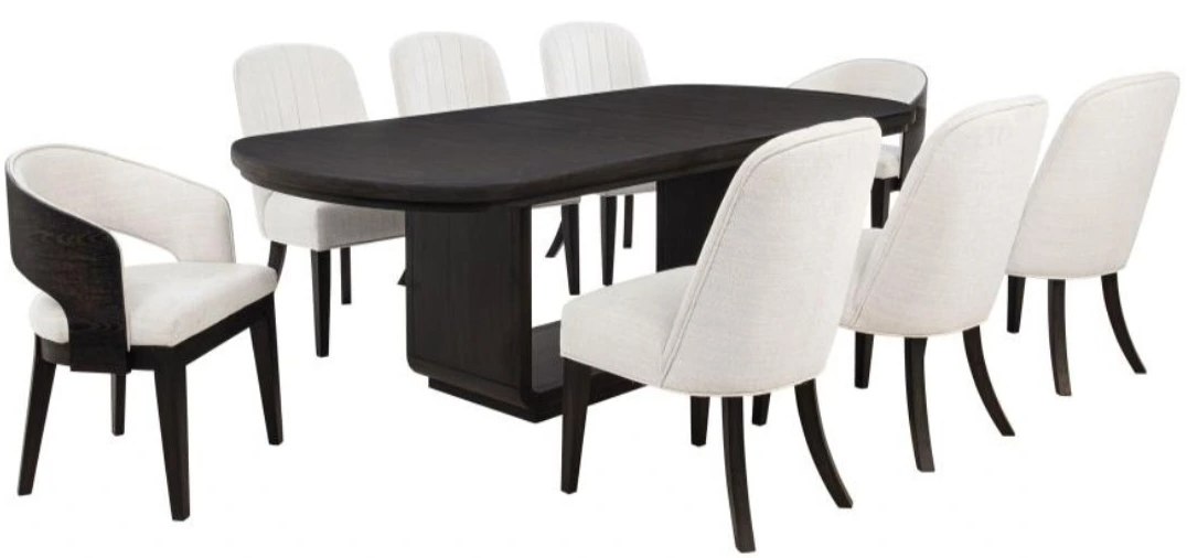 Designed for connection and crafted with grace, this dining set brings architectural beauty to everyday meals and special gatherings alike. A rectangular extension table, finished in burnished black, expands with a removable leaf and smooth cable glides to accommodate more seats with ease.Read More