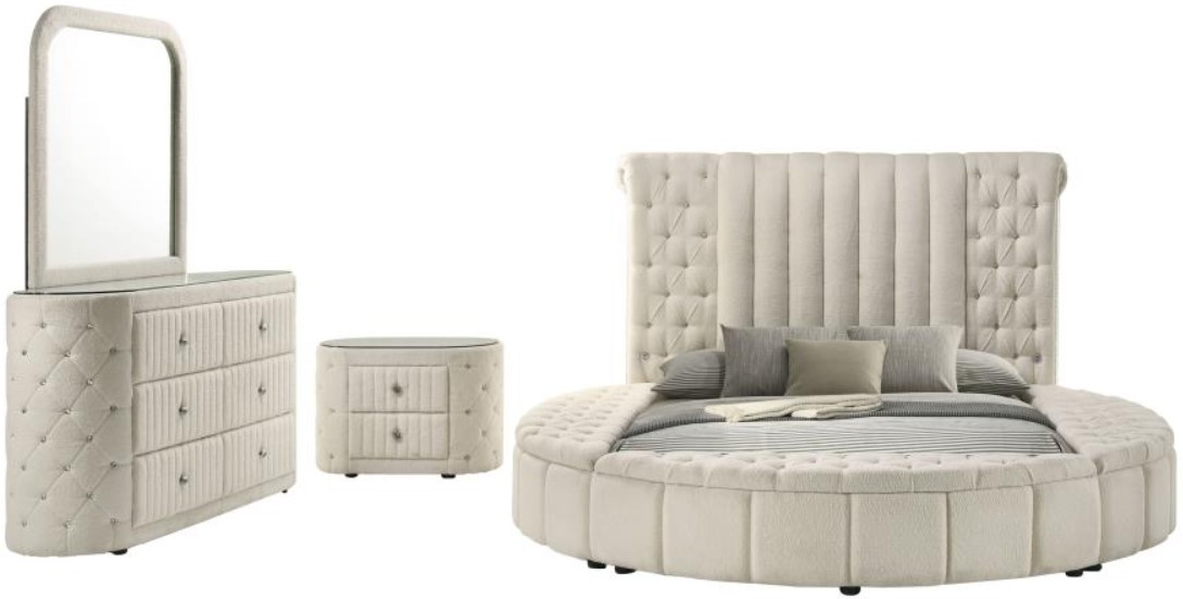 Embrace the art of retreat with a bedroom set that transforms luxury into an experience. Anchored by a grand round bed wrapped in plush velvet, the design features a sculpted scroll headboard with deep tufting and vertical channeling.Read More
