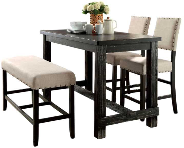 Rustic charm hits its peak with this stunning counter height dining set. The rustic wood grain and distressed black finish take you to a charming farmhouse somewhere in the countryside, achieving an inviting, homey atmosphere that will have family and friends coming back for more. Beige linen-like upholstery adds a brightening effect while the seating pieces come adorned with nailhead trim.