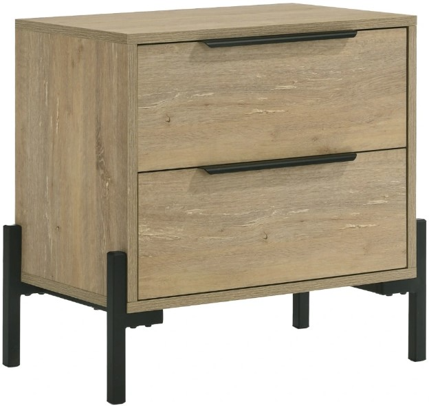 The modern Newhall melamine bedroom group features a perfect balance of clean lines, chic styling and practicality. The group features a light vintage oak melamine with metal legs and wide drawer pulls with a dark burnished black finish.Read More