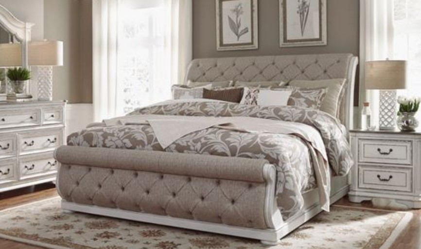 Opt for an elegant display. A refined yet relaxed feel describes the Magnolia Manor king upholstered sleigh bed, dresser, mirror, and nightstand. Crafted of poplar solids with white oak and birch veneers, this kit features an antique white finish with heavy artistic chipping and weathered brown with whitewash tops.Read More