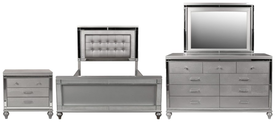 Glitz and Glam Details: A gleaming Silver finish, mirrored trims and alligator embossed inlays evoke a Hollywood glam appeal