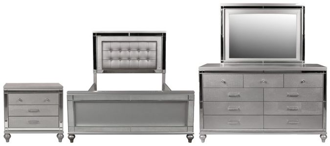The Valentino 4-Piece Bedroom Set exudes opulence with its shimmering silver finish. This set includes a grand California king bed, a coordinating dresser, nightstand, and an elegant mirror. The sophisticated design and luxe color create a striking and serene bedroom retreat.Read More
