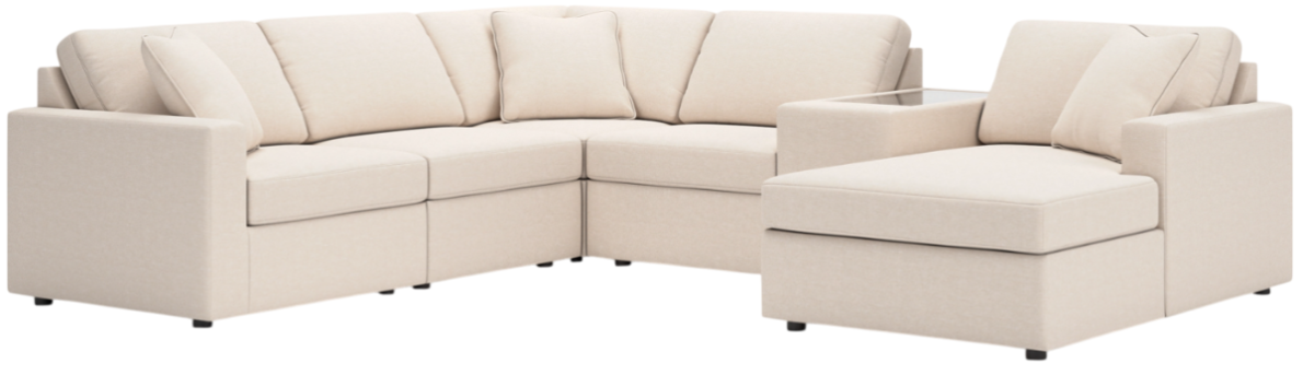 Includes 6 Modular Pieces: Left-arm facing corner chair, 2 armless chairs, console with storage, wedge and right-arm facing corner chaise